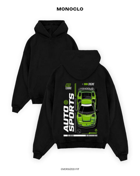 Купити худі Monoclo Auto Sports 🏁 — яскраве утеплене худі в стилі автоспорту. Принт із зеленим спорткаром і надписами Auto Tuning / Engine створено для фанатів драйву та швидкості.