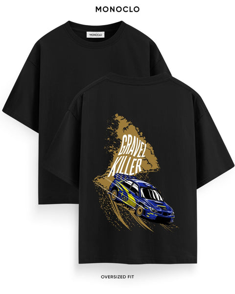 Принт присвячений Subaru Impreza WRX STI – легендарному ралійному автомобілю, відомому своєю маневреністю та потужністю. На спині футболки зображено автомобіль у русі на ґрунтовій трасі з ефектом бруду, а напис "Gravel Killer" у стильному шрифті підкреслює дух ралійної боротьби.