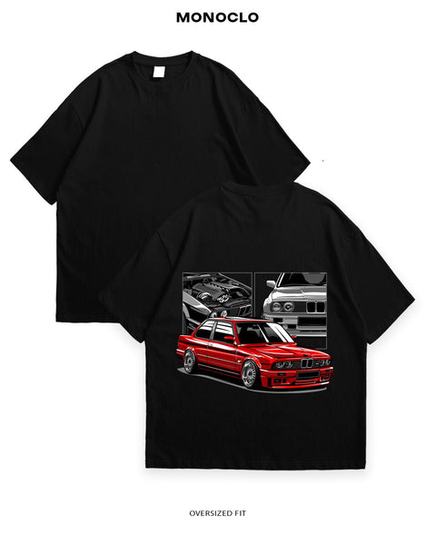 • Дизайн: Принт із зображенням BMW E30 у червоному кольорі з деталями двигуна та передньої частини, мінімалістичний передній бік
