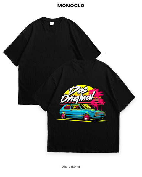 Принт присвячений VW Golf у стильному ретро-виконанні з блакитним кузовом і яскравими акцентами. Дизайн із пальмами та написом "Das Original" передає атмосферу 80-х і любові до класичних автомобілів.
